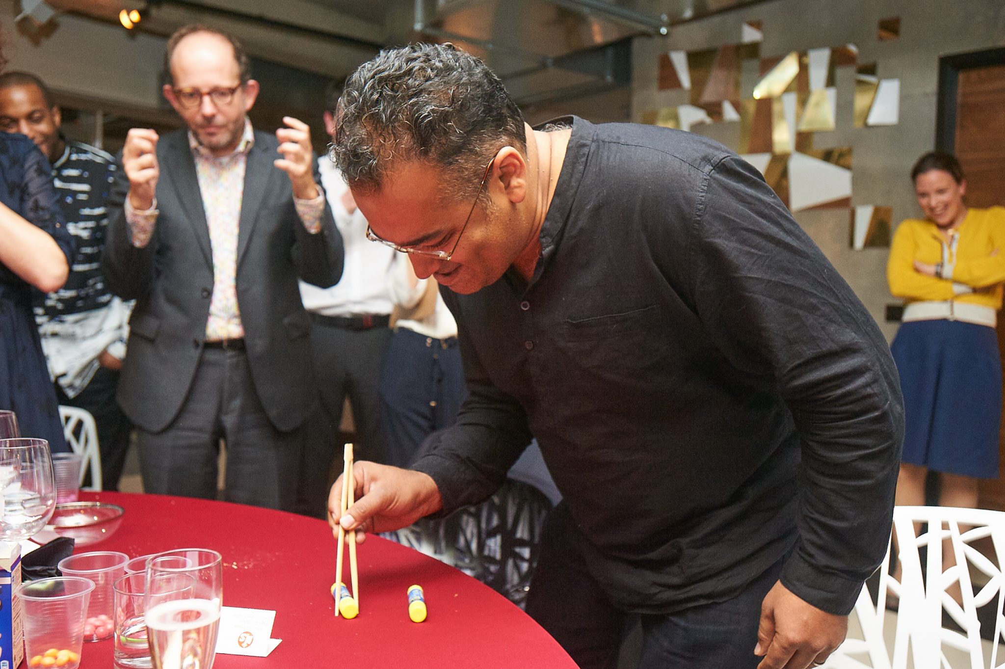 It was right up to the wire when team Penguish and team Quiz Team Aguilera attempted ‘a minute to win it’ challenge. Krishnan Guru-Murthy was a dab hand at Skittle separation but stacking glue-sticks sadly beat both teams.